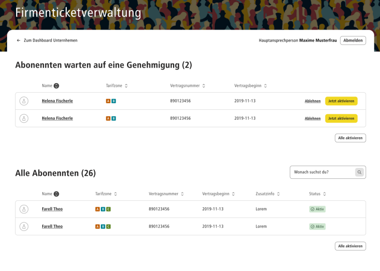 Unsere Plattform ist darauf ausgerichtet Ihre Geschäftsprozesse zu optimieren und die Verwaltung von Abonnentendaten, Rahmenverträgen und Mitarbeiterabonnements so einfach und effizient wie möglich zu gestalten. Ein besonderes Merkmal unserer Lösung ist die Selbstverwaltung, die es dem privaten Abonnenten aber auch Firmenkunden ermöglicht Ihre Abonnements eigenständig und rund um die Uhr anzulegen und zu verwalten. Sachbearbeitende Ihrer Firmenkunden haben zusätzlich die Möglichkeit die Abonnements der Firmentickets für die Mitarbeiter zu pflegen und zu verwalten. Das steigert nicht nur die Effizienz und entlastet Ihre Kollegen im Trägerunternehmen, sondern gibt Ihren Kunden zusätzlich die Kontrolle über die Verträge und Abonnements.